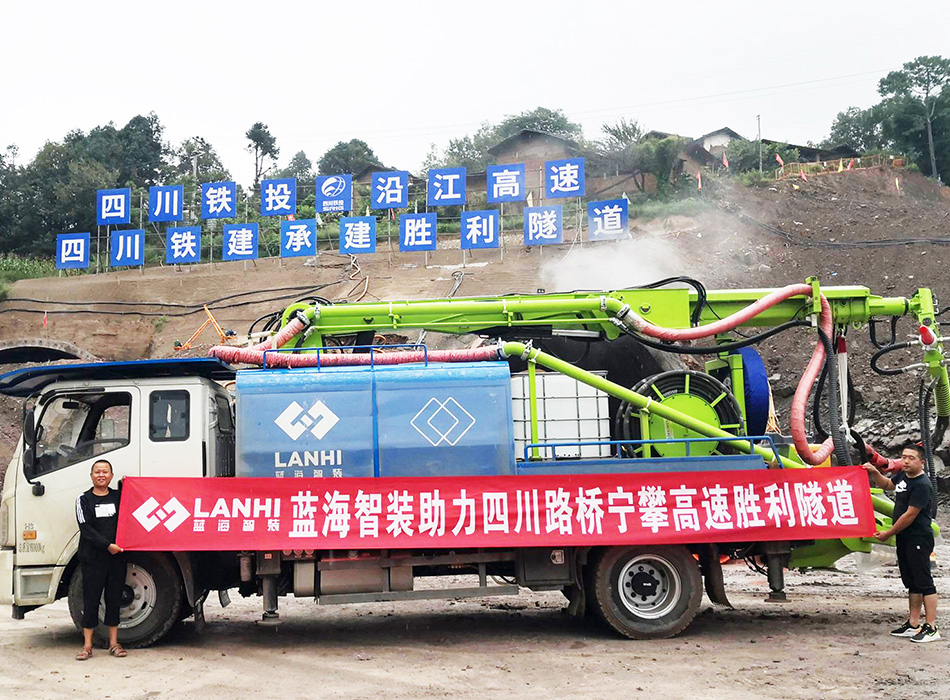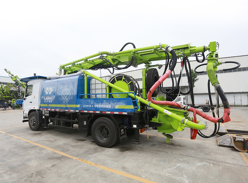 LCHP40D車載濕噴機械手采用汽車底盤,是一款綜合國內(nèi)隧道初支混凝土噴錨工藝及施工情況研發(fā)升 級的一款專用設(shè)備。該設(shè)備具有噴射方量大(最大噴射方量40m3/h)、不易堵管、回彈低、機動性好、性能 穩(wěn)定可靠等特點。解決了傳統(tǒng)小型濕噴機不能滿足大、長隧道混凝土噴射的不足,提高了施工效率,減少了 混凝土消耗量,切實保障施工質(zhì)量。